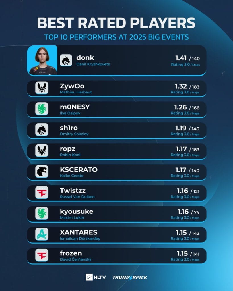 HLTV verilerine göre 2025’teki büyük etkinliklerde en yüksek ratinge sahip oyuncuların tam listesi şu şekildedir: