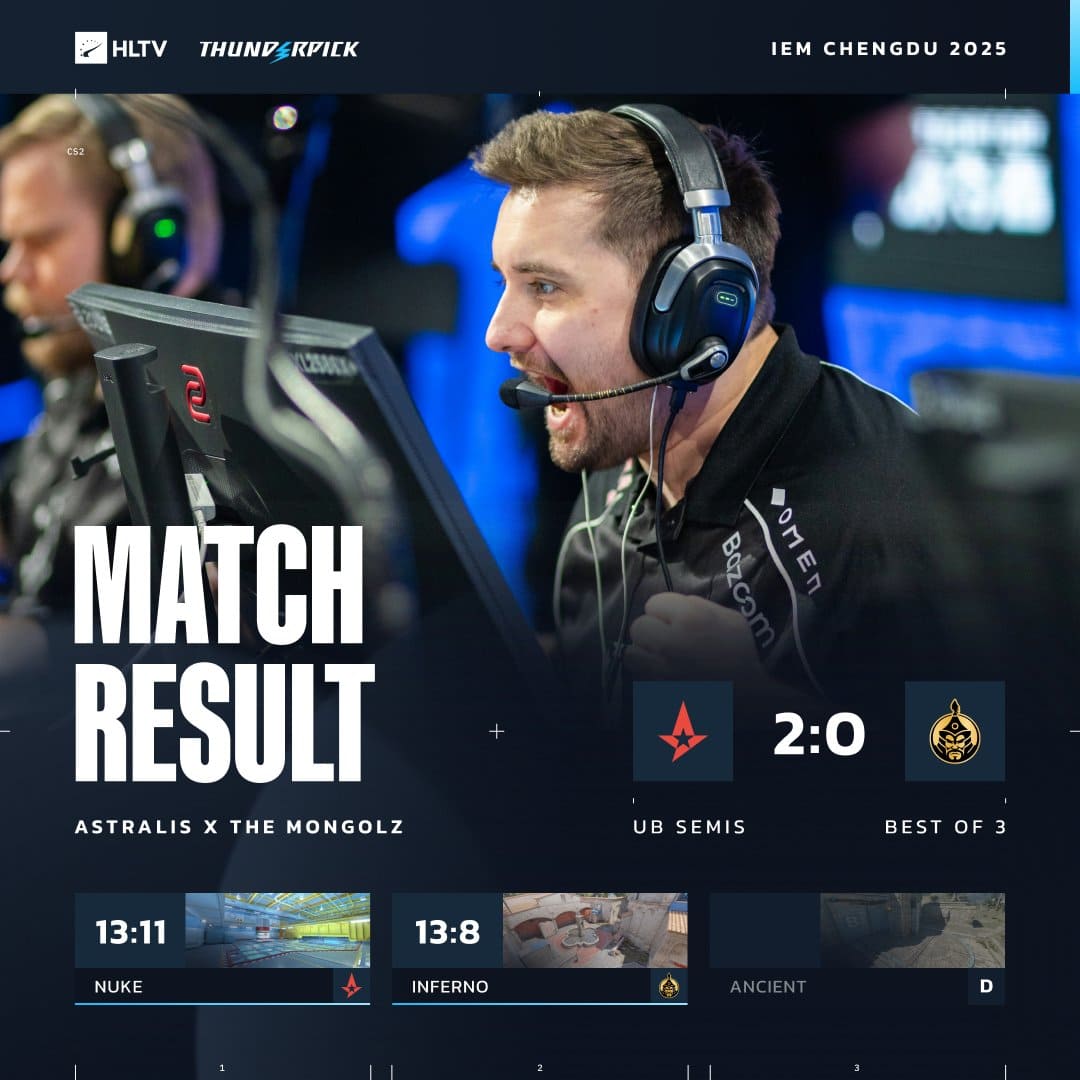 IEM Chengdu 2025’in Grup A üst parantez yarı finali, 4 Kasım 2025’te gerçekleşti ve en iyi 3 serisi (BO3) formatında oynandı. Astralis, turnuvanın açılış gününde NAVI’yi 2-1’lik zorlu bir mücadeleyle geçmişti. Bu motivasyonla sahaya çıkan Danimarkalılar, The MongolZ karşısında disiplinli bir performans sergiledi.