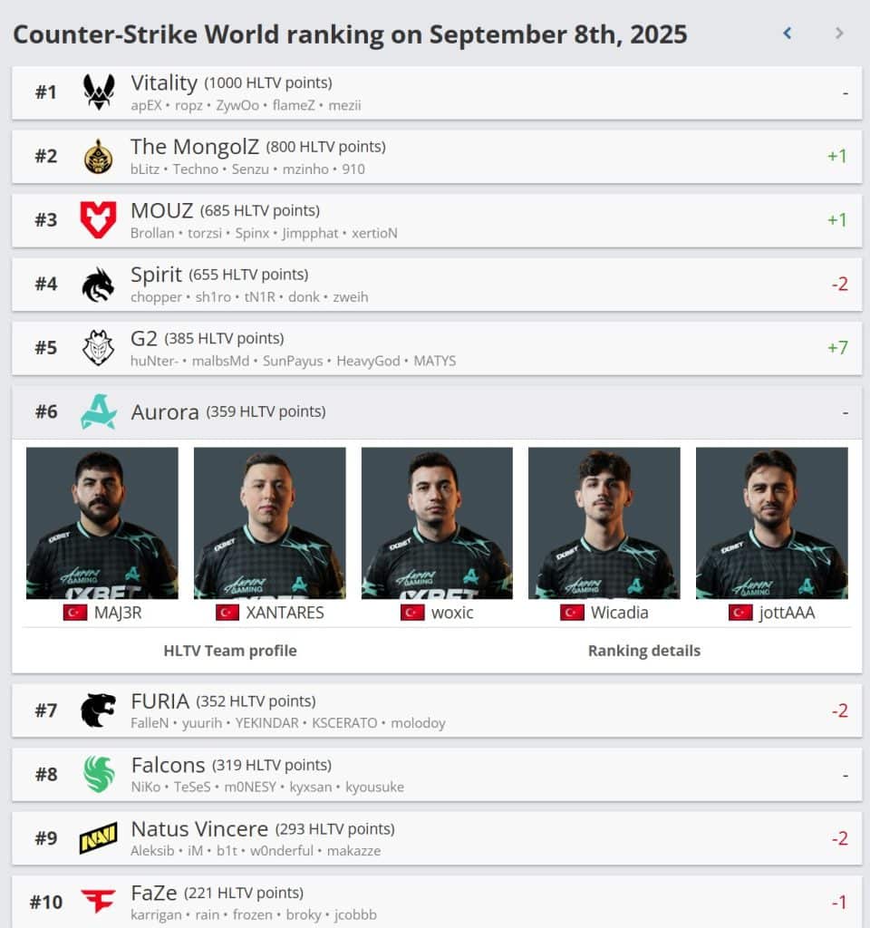 Counter-Strike: sahnesinde heyecan sürerken, 8 Eylül 2025 tarihli HLTV dünya sıralaması açıklandı. Listede Türk temsilcimiz Aurora, 359 puanla 6. sırada yer alarak büyük bir başarıya imza attı.