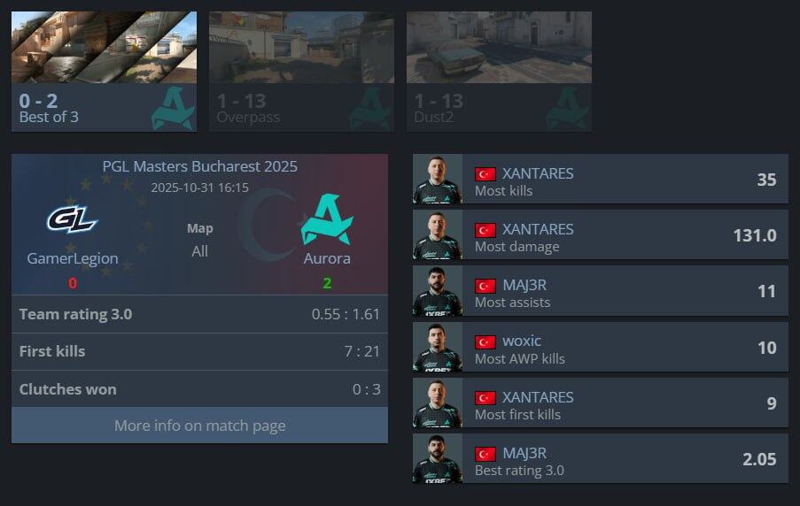 Aurora, PGL Masters Bucharest yarı finalinde GamerLegion’ı baştan sona ezdi, Overpass ve Dust2’de iki kez 13-1’lik skorlarla uluslararası ekibi darmadağın etti.
