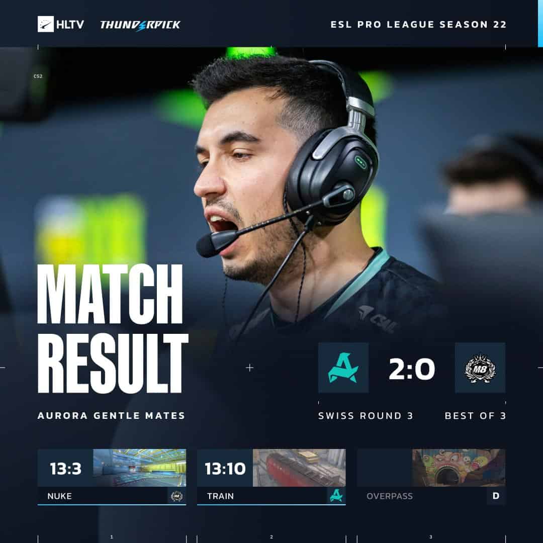 Aurora, bu sonuçla Swiss etabındaki iddiasını güçlendirdi. Gentle Mates ise harita başlarındaki kırılma anlarında daha yüksek verim almanın yollarını aramak zorunda kalacak.