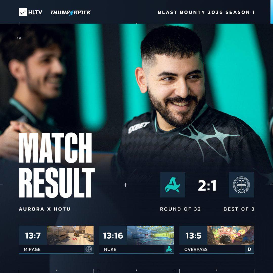 Aurora, BLAST Bounty çevrimiçi aşamasının ilk gününü HOTU karşısında aldığı 2-1’lik galibiyetle noktaladı. Nuke haritasında yaşanan beklenmedik sarsıntıya rağmen temsilcimiz, yeni transferi Caner “soulfly” Kesici’nin ilk maçında sezona doğru bir başlangıç yapmayı başardı.