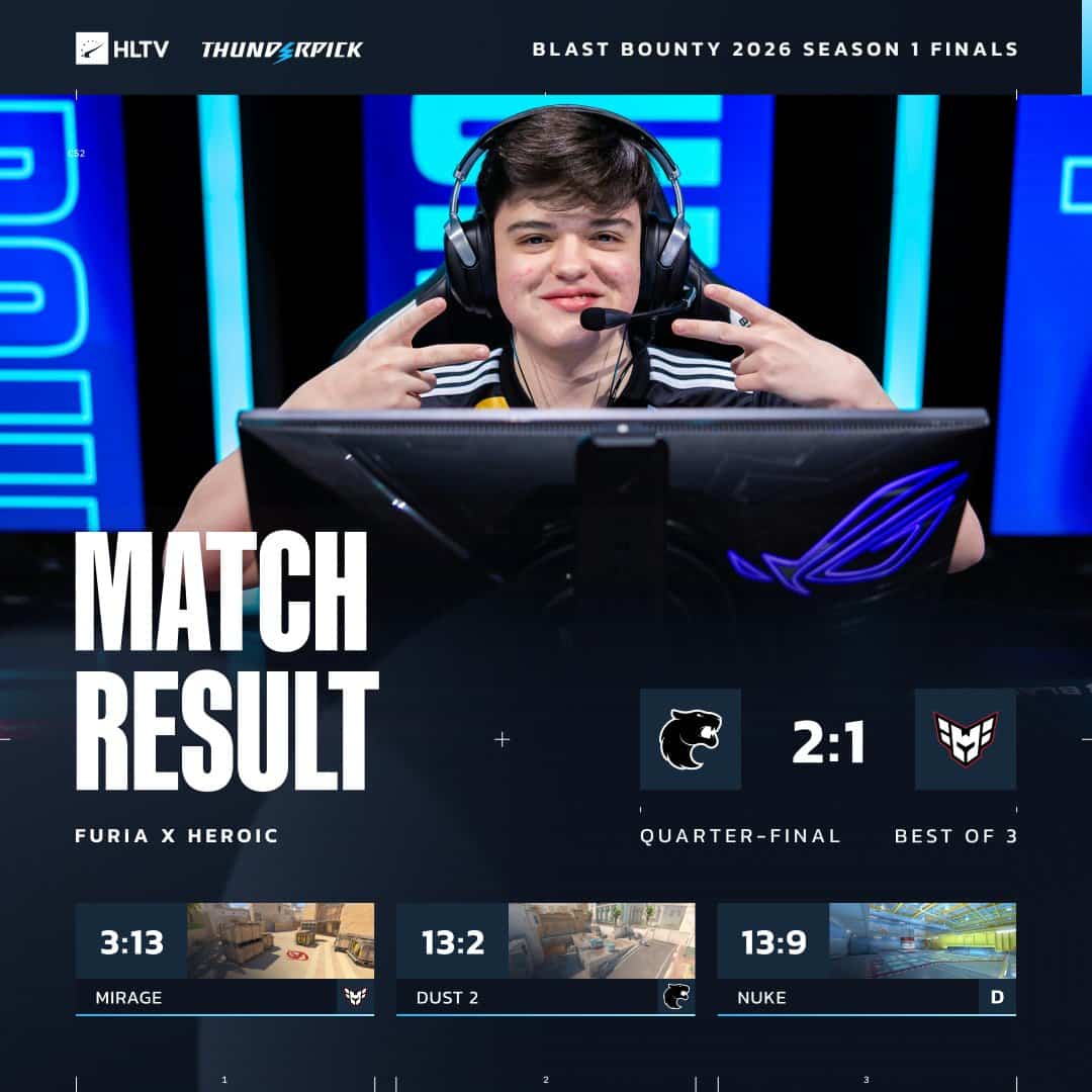 Günün ikinci ve en çekişmeli maçında ise HEROIC ile FURIA karşı karşıya geldi. Saat 20:00 seansında başlayan mücadele büyük bir rekabete sahne oldu. Üç harita süren bu zorlu serinin sonunda gülen taraf, rakibini 2-1‘lik skorla geçen Brezilya temsilcisi FURIA oldu.