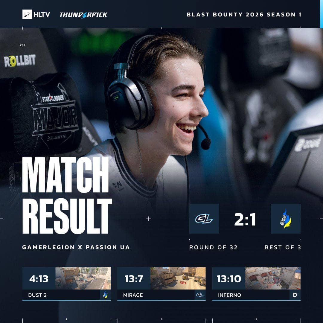Turnuvanın Son 32 (Round of 32) turunda karşı karşıya gelen GamerLegion ve Passion UA arasındaki mücadele, üç haritalık (BO3) bir seri olarak gerçekleşti. Passion UA, seriye oldukça hızlı bir giriş yaparak rakibini ilk haritada baskı altına alsa da, GamerLegion tecrübesiyle maçı çevirmesini bildi.