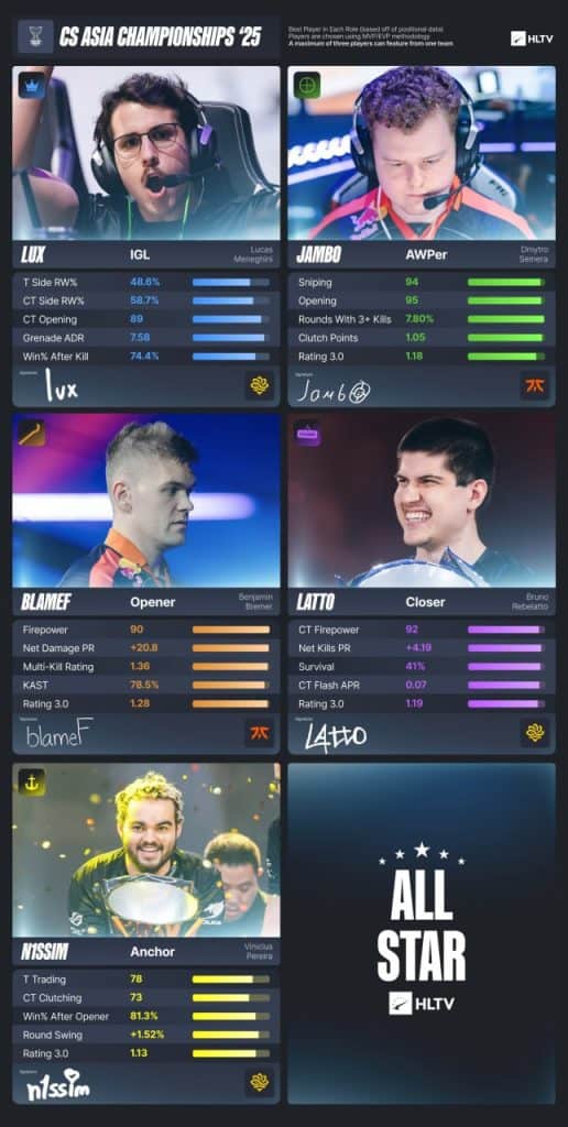 Dmytro “jambo” Semera, fnatic’in harita ve tur kazanışlarında blameF’ten daha iyiydi (1.40 rating, tur başına 1.17 kill) ama 3DMAX’a karşı kötü belirleyici ve HEROIC’a karşı 5-13 harita bir ile kenarda kaldı.