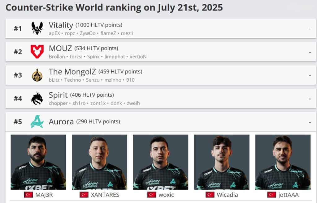 HLTV’nin haftalık Counter-Strike sıralamasına göre, işte 21 Temmuz 2025 itibarıyla dünyanın en iyi 5 takımı: