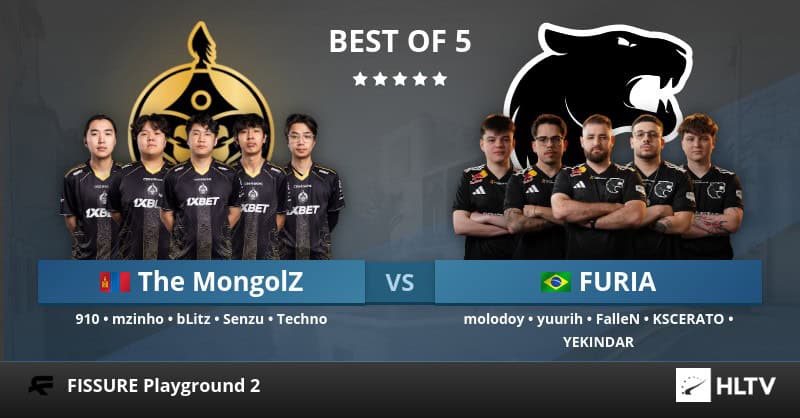 Brezilya temsilcisi FURIA, CS sahnesinde yıllardır adından söz ettiren bir ekip. FISSURE Playground 2’de zorlu rakiplerini birer birer eleyen FURIA, finalde The MongolZ karşısında tecrübesiyle öne çıkmak istiyor. Güçlü bireysel yetenekleri ve taktiksel disipliniyle şampiyonluk yolunda iddialılar.
