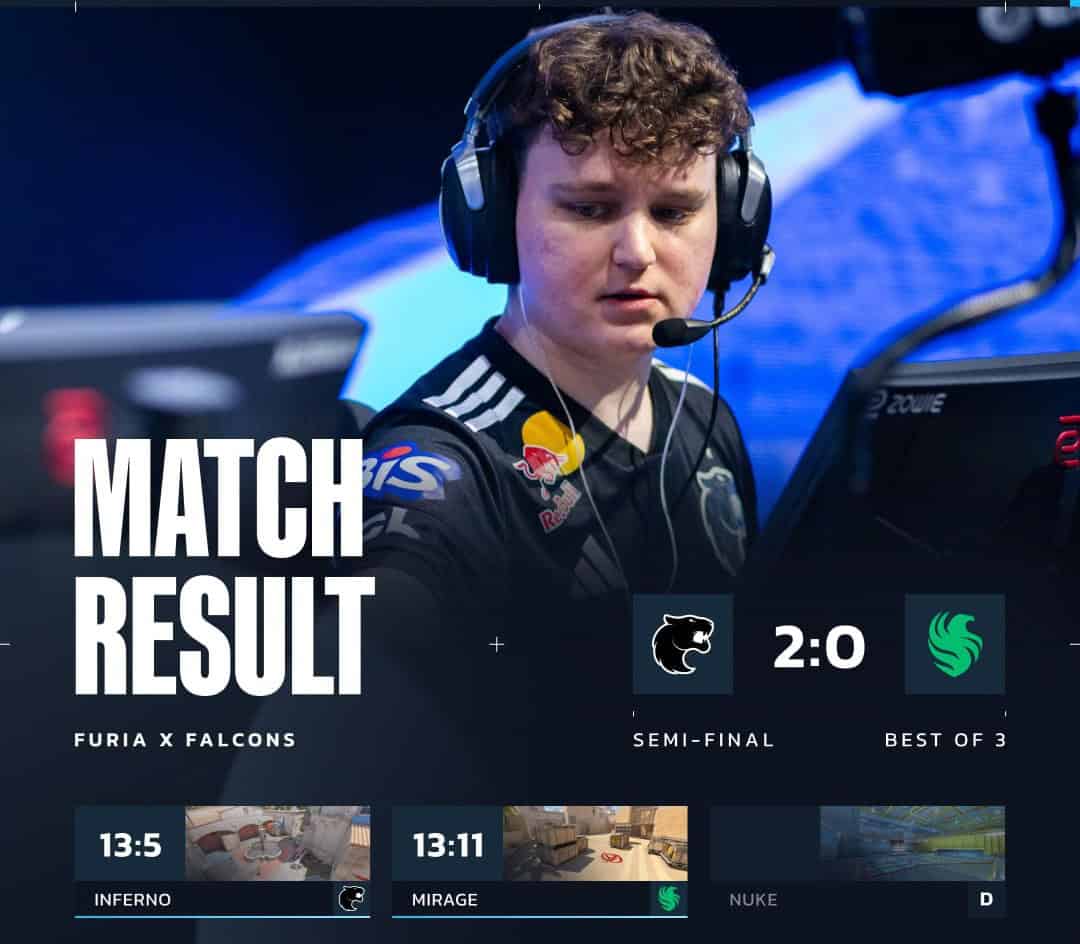 FURIA, finalde Vitality ile 285 bin dolarlık şampiyonluk için çarpışacak (9 Kasım TSİ 16:00). Bu, yaz arasından beri 3. büyük final! Falcons ise 3.lük maçında MOUZ’la bronz için uğraşacak (TSİ 12:00).