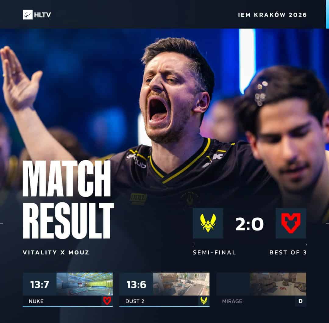 Intel Extreme Masters Krakow 2026‘nın ikinci finalisti Vitality oldu. Yarı final mücadelesinde MOUZ ile karşılaşan Fransız devi, rakibini 2-0’lık net bir skorla (Nuke 13:7, Dust 13:6) mağlup ederek adını büyük finale yazdırdı.