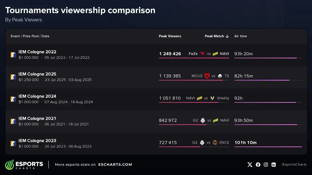 2025 yılındaki tüm espor turnuvaları arasında IEM Cologne 2025, en yüksek izleyici sayısına göre dördüncü sırada yer aldı. Üstünde yer alan turnuvalar şunlar oldu:
