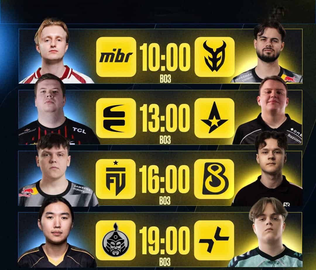 Günün açılış maçında Brezilya temsilcisi MIBR ile 3DMAX kozlarını paylaşacak. Hemen ardından saat 13:00’te köklü Danimarka ekibi Astralis, İsveç temsilcisi EYEBALLERS ile yarı final bileti için çarpışacak.