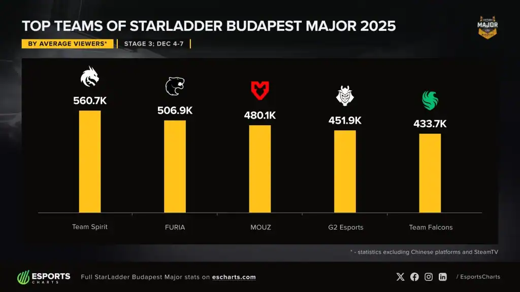 Esports Charts tarafından paylaşılan verilere göre Team Spirit, maç başına ortalama 560 binin üzerinde izleyiciye ulaşarak etabın “en popüler takımı” unvanını kazandı. “Ejderhalar” lakaplı ekip, hem sahadaki dominasyonu hem de medya gücüyle zirveye yerleşti.