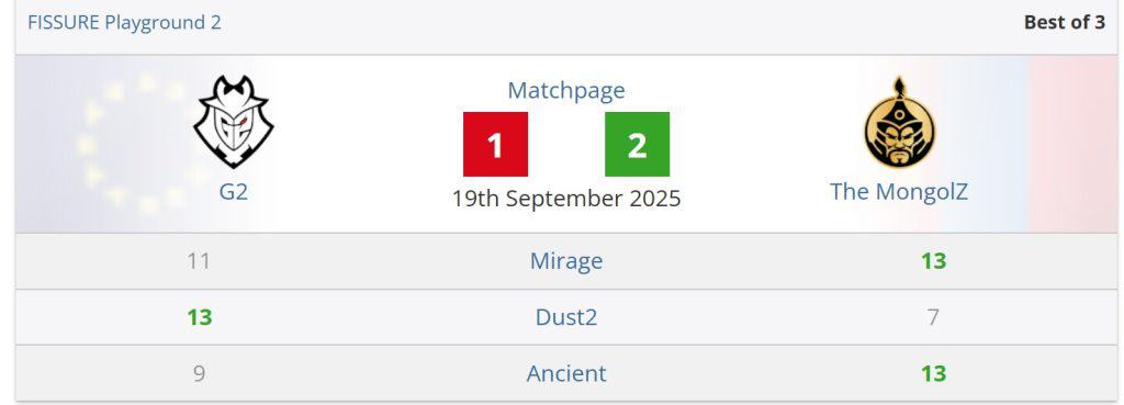The MongolZ günün ilk FISSURE Playground 2 çeyrek finalinde G2’yi mağlup ederek, Mirage haritasında 13-11 üstünlük sağlayıp Dust2’de 7-13 geride kalmasına rağmen Ancient’te 13-9’la seriyi tamamladı.