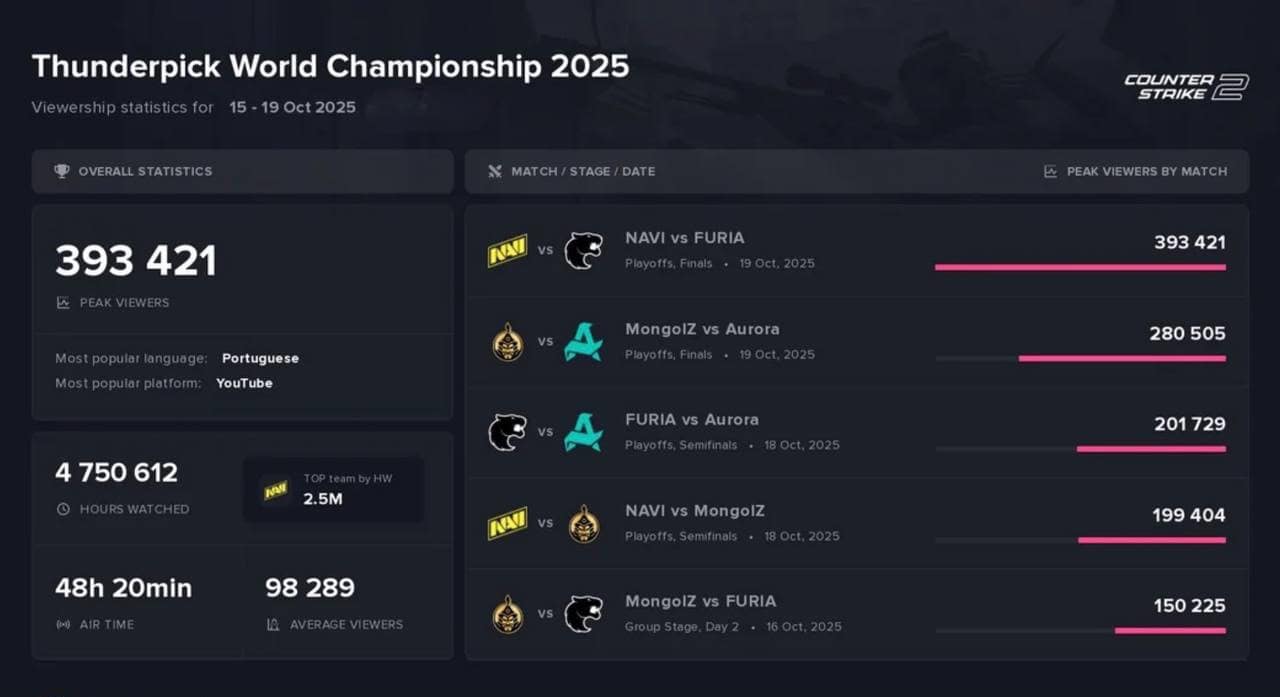 Thunderpick Dünya Şampiyonası 2025, 15-19 Ekim 2025 tarihleri arasında Counter-Strike 2 tutkunlarını ekran başına topladı ve izleyici rekorlarına imza attı. Büyük finalde Natus Vincere ile FURIA arasındaki nefes kesen mücadele, 393.421 zirve izleyiciyle turnuvanın en çok izlenen maçı oldu. Türk takımı Aurora’nın iki maçı, en çok izlenenler arasında yer alarak dikkat çekti. İşte turnuvanın izlenme istatistikleri ve öne çıkan maçlar!