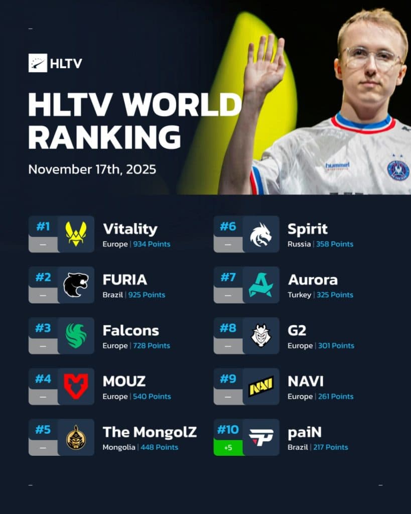 Vitality’nin 934 puanla zirvedeki egemenliği (ZywOo ve ropz etkisiyle), FURIA’nın 925 puanıyla 2’nciliği Brezilya gücünü yansıtıyor. Moğol The MongolZ ise 448 puanla 5’nci – Asya yükselişi devam ediyor.