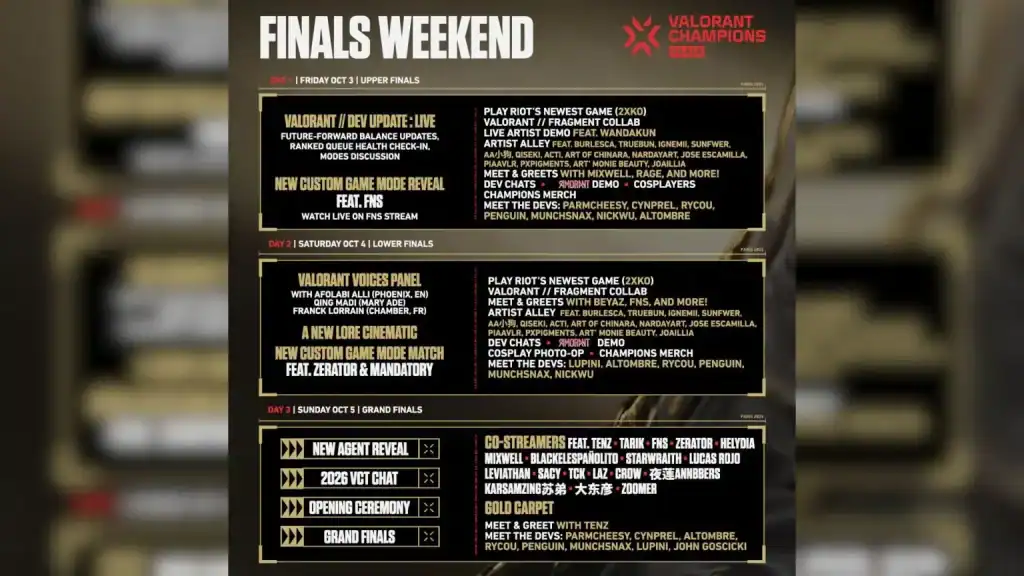 Etkinlik, yeni ajan tanıtımı, açılış töreni ve Riot’un 2026 VCT değişiklikleri hakkında detaylarla başlayacak. Birçok oyuncu ve içerik üreticisi, Altın Halı’da yürüyecek ve büyük final eşleşmesi hakkındaki düşüncelerini paylaşacak. Son olarak, Tyson ‘TenZ’ Ngo, etkinliğin kapanış tanışma seansında hayranlarla buluşacak.