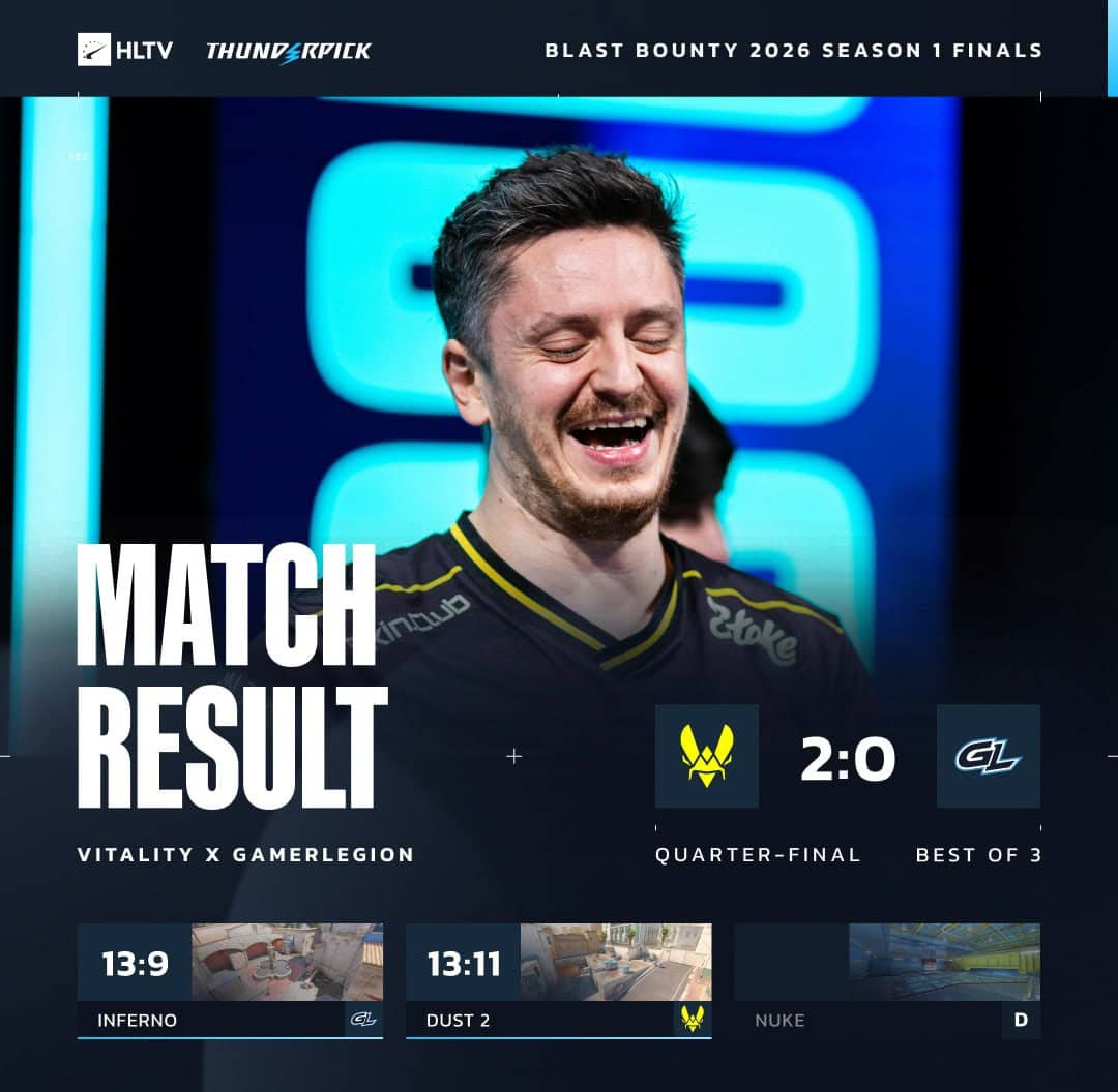 Counter-Strike 2 arenasında heyecan devam ederken Vitality, BLAST Bounty 2026 S1 çeyrek final mücadelesinde GamerLegion’u saf dışı bıraktı. Dan “apEX” Madesclaire liderliğindeki ekip, Inferno ve Dust2 haritalarında rakibini sırasıyla 13-9 ve 13-11’lik skorlarla mağlup ederek seriyi 2-0 kazandı.